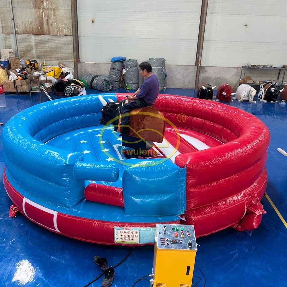 Introducing the Inflatable Rodeo Bull FLRB1009, a commercial inflatable rodeo bull ride designed for events, amusement parks, carnivals, and party rental businesses.This model features a 5-meter round inflatable safety mat with a flag cartoon design, creating a colorful and playful visual effect that attracts attention and enhances the fun atmosphere. It is especially suitable for family events, festivals, themed parties, and rental operations.